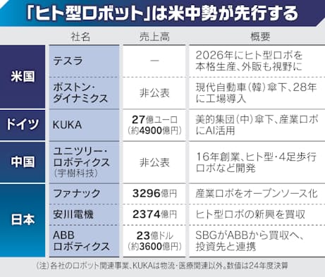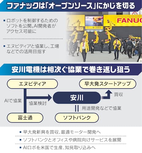 製造現場に眠るデータと人工知能(AI)との融合を見越したロボットの開発競争が加速する。ソフトバンクグループ(SBG)によるスイス重電大手ABBのロボット事業買収を機に安川電機やファナックが協業や制御関連ソフトの公開化などを相次ぎ表明した。機械を自律的に動かすフィジカルAIで米中に後れを取る日本勢は「ロボット大国」復権に懸ける。